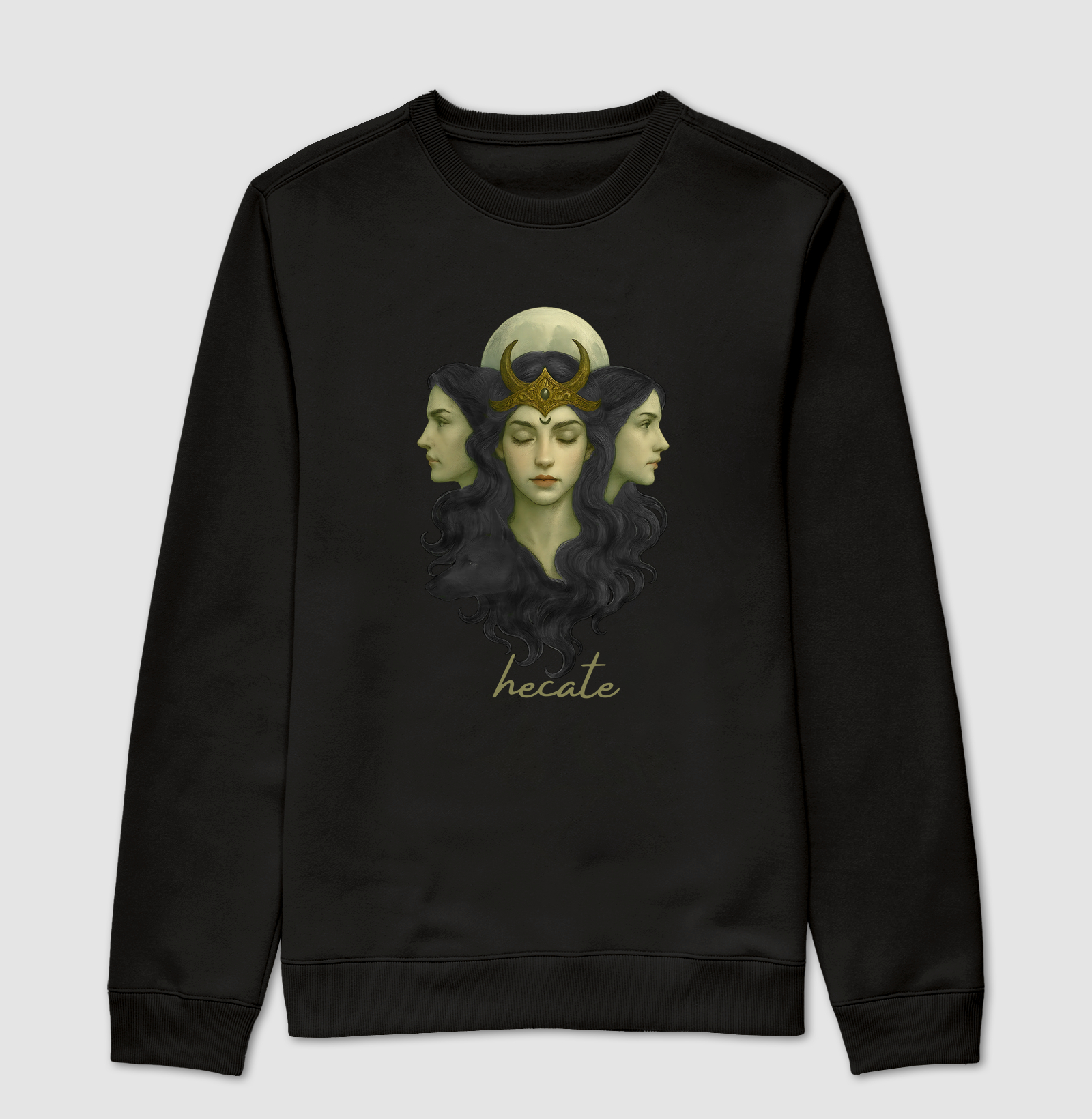 A estampa “Hécate Tríplice – Retratos Divinos” revela a deusa em sua forma tríplice, senhora das encruzilhadas e do destino. Representada com três faces e acompanhada pela lua e seu cão, simboliza poder, sabedoria e proteção espiritual. Uma arte que celebra o mistério, a magia e a força ancestral do sagrado feminino.