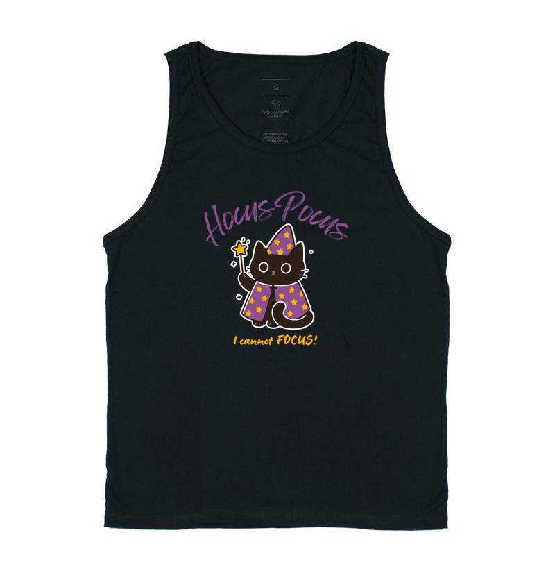 A estampa "I Cannot Focus" traz um gatinho preto mágico com capa roxa estrelada e a frase divertida "Hocus Pocus, I cannot Focus!". Um design fofo, místico e cheio de humor para amantes de gatos e bruxaria.